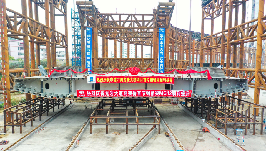 2019年12月31日上午9:28,龍巖大橋主橋首片鋼箱梁開始吊裝,標志著龍巖大橋主橋正式進入鋼箱梁施工階段。首片鋼箱梁提升、滑移、頂推共歷時約8小時完成,整個主橋結(jié)構(gòu)共有26片鋼箱梁。