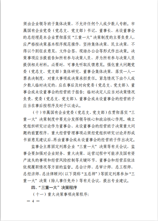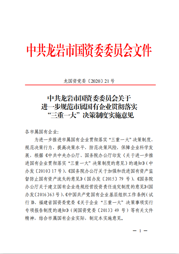 關(guān)于進(jìn)一步規(guī)范市屬?lài)?guó)有企業(yè)貫徹落實(shí)“三重一大”決策制度實(shí)施意見(jiàn)(國(guó)資黨委[2020]21號(hào))